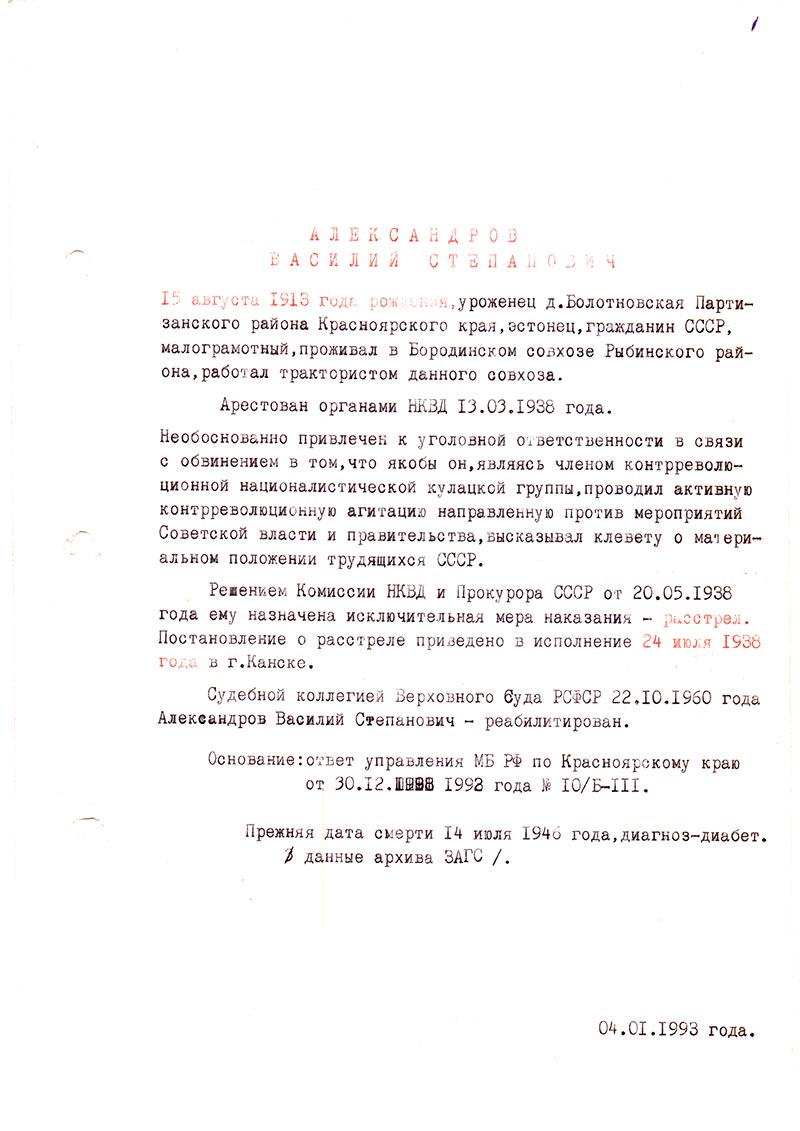 15 августа 1913 года рождения, уроженец д. Болотновская Партизанского района Красноярского края, эстонец, гражданин СССР, малограмотный, проживал в Бородинском совхозе Рыбинского района, работал трактористом данного совхоза.