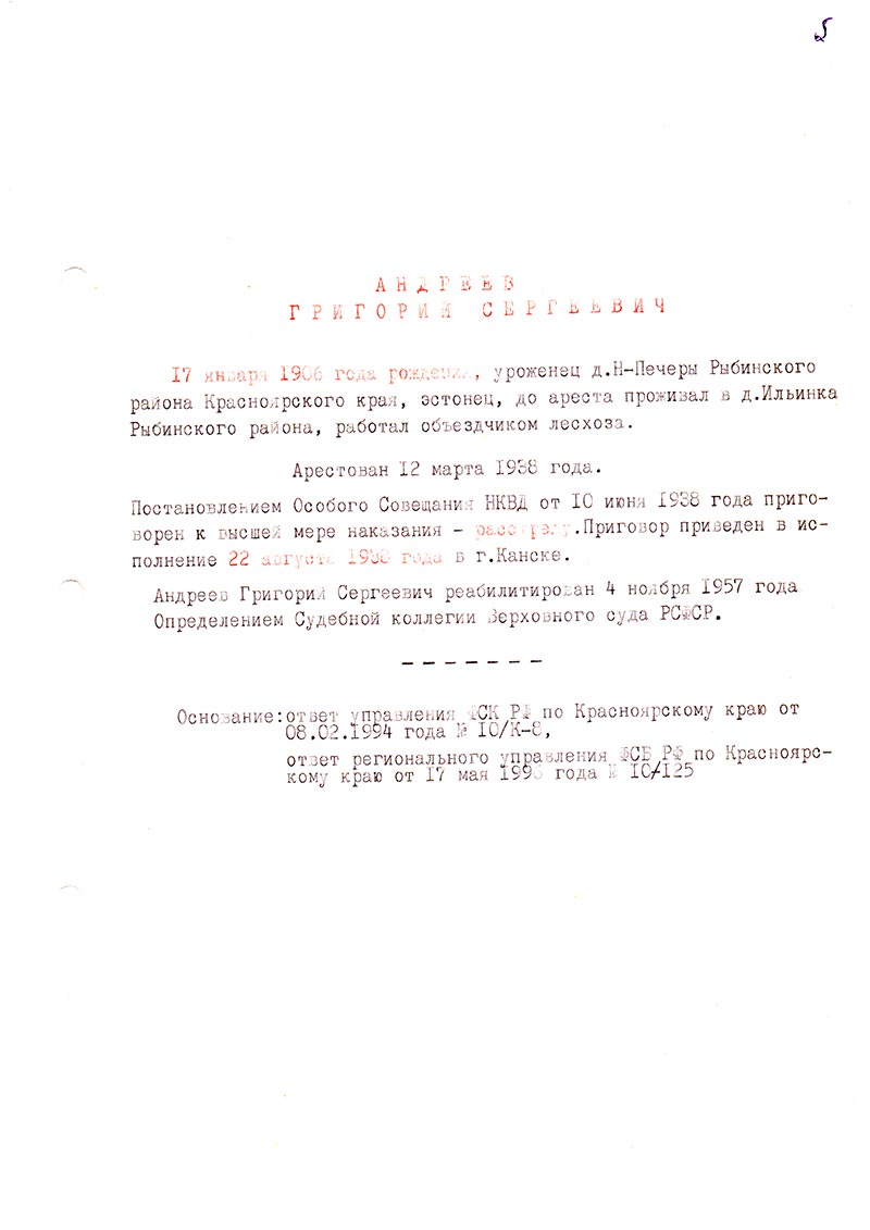 Андреев Григорий Сергеевич реабилитирован 4 ноября 1957 года Определением Судебной коллегии Верховного суда РСФСР.