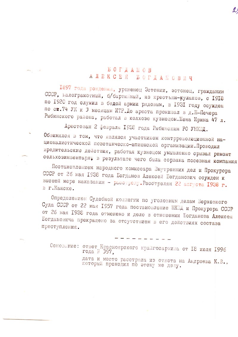 Постановлением народного комиссара Внутренних дел и Прокурора СССР от 26 мая 1938 года Богданов Алексей Богданович осужден к высшей мере наказания — расстрелу. Расстрелян 22 августа 1938 г. в г. Канске.