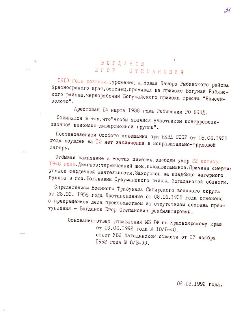 Определением Военного Трибунала Сибирского военного округа от 28.03. 1958 года Постановление от 08.06.1938 года отменено с прекращением дела производством за отсутствием состава преступления — Богданов Егор Степанович реабилитирован.