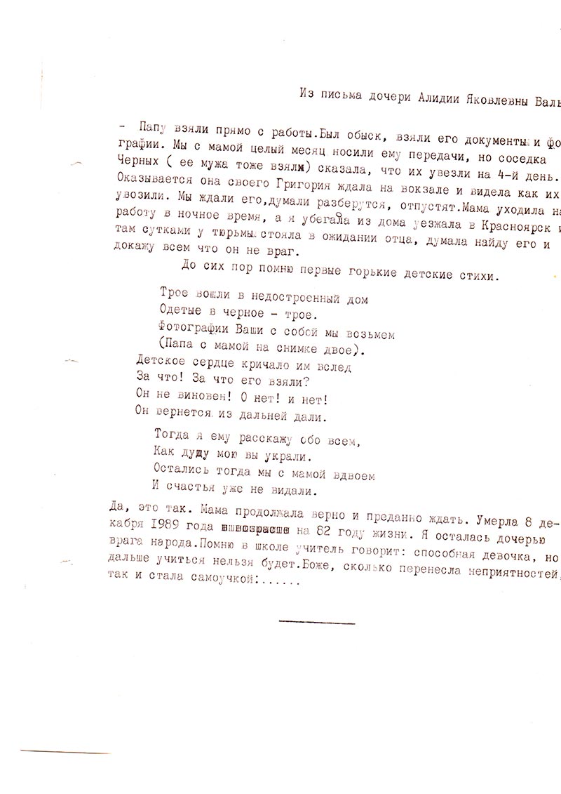 — Папу взяли прямо с работы. Был обыск, взяли его документы и фотографии. Мы с мамой целый месяц носили ему передачи, но соседка Черных (ее мужа тоже взяли) сказала, что их увезли на 4-й день. Оказывается она своего Григория ждала на вокзале и видела как их увозили. Мы ждали его, думали разберутся, отпустят. Мама уходила на работу в ночное время, а я убегала из дома уезжала в Красноярск и там сутками у тюрьмы стояла в ожидании отца, думала найду его и докажу всем что он не враг.