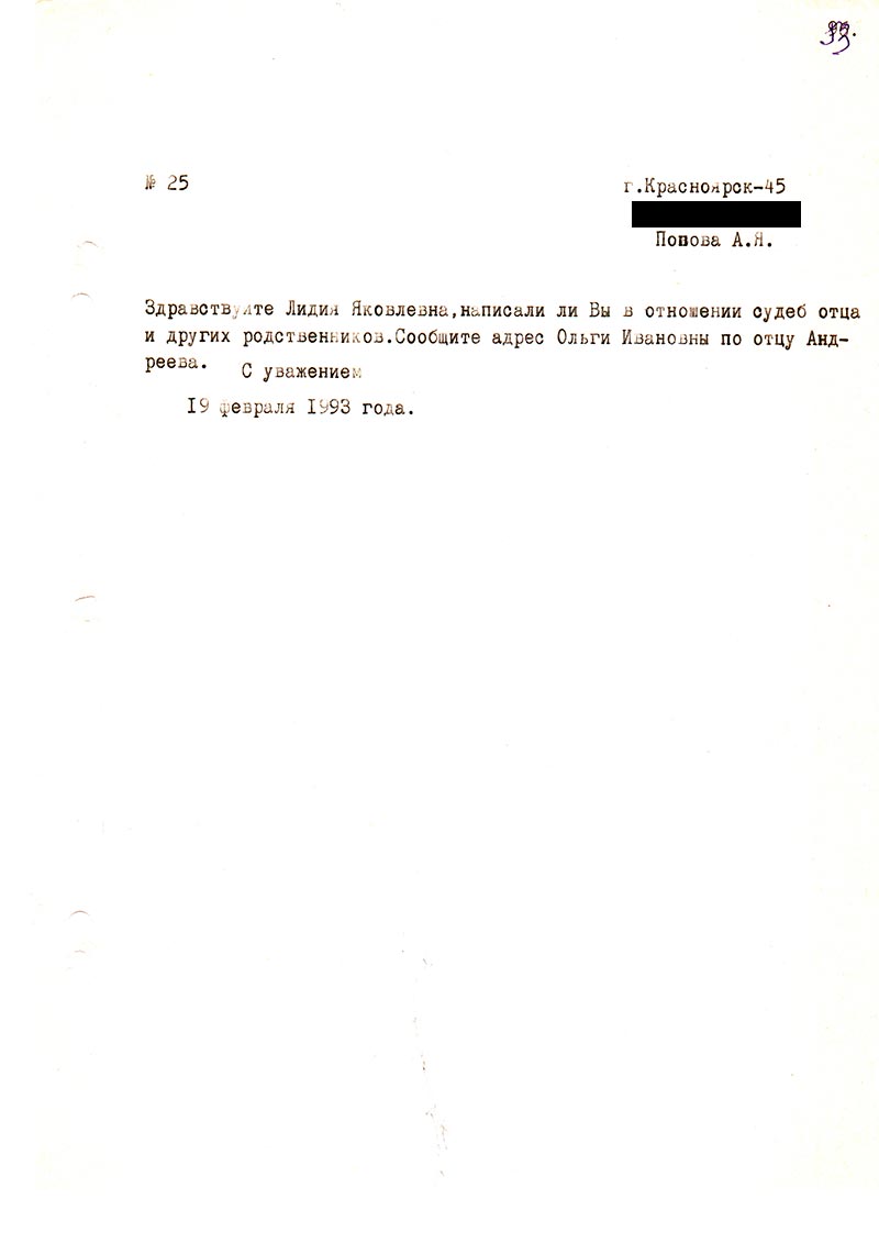 Только что получила Ваше неожиданное, но в то же время долгожданное письмо. Я верила и знала, что когда-то, кто-то заинтересуется судьбой людей, так несправедливо и жестоко обиженных. И этим человеком оказались Вы. Спасибо Вам!