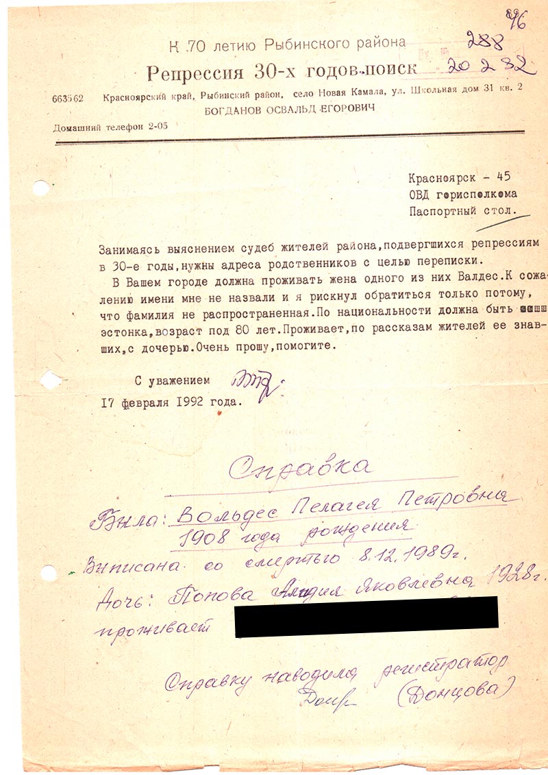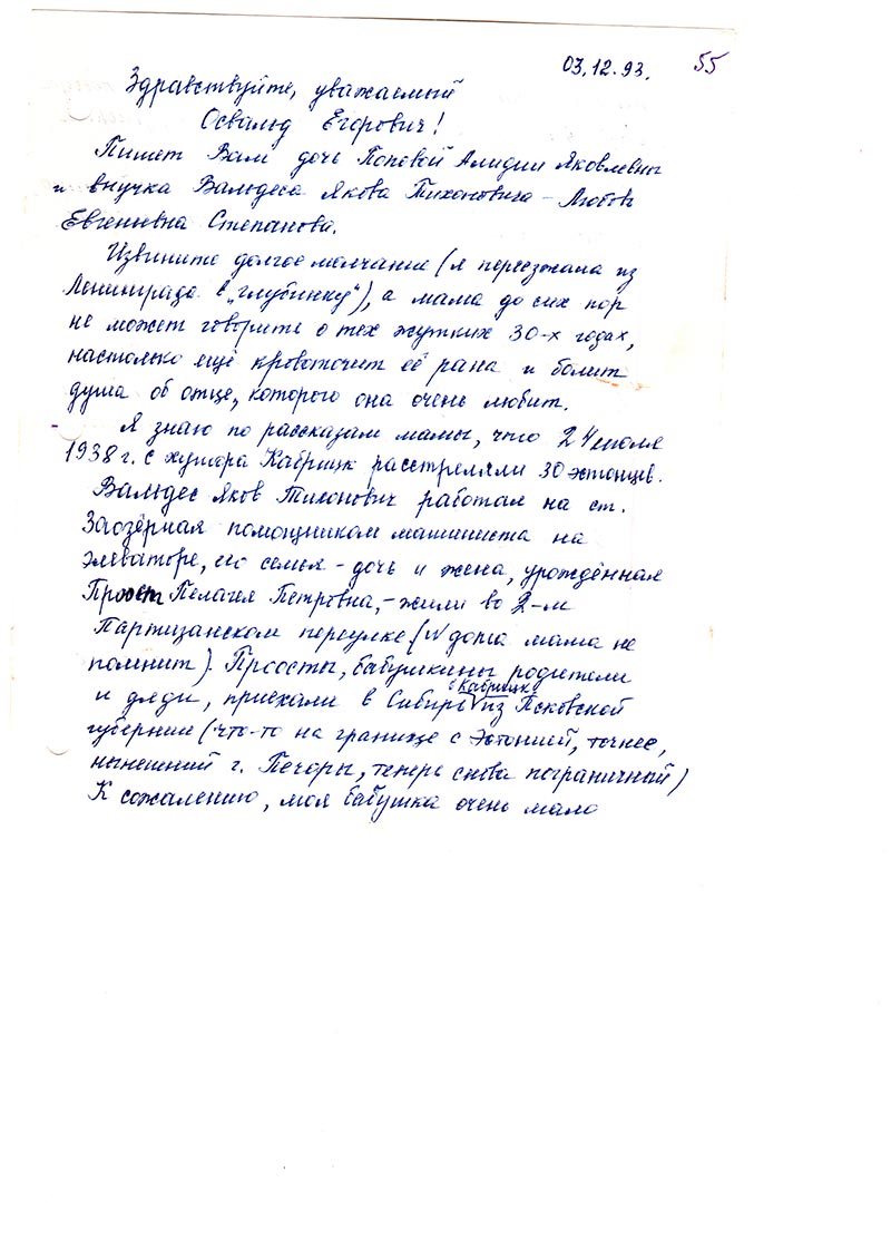 Я знаю по рассказам мамы, что 24 июля 1938 г. с хутора Кабрицк расстреляли 30 эстонцев. Вальдес Яков Тихонович работал на ст. Заозерная помощником машиниста на элеваторе, его семья — дочь и жена, урожденная Проост Пелагея Петровна, — жили во 2-м Партизанском переулке (№ дома мама не помнит). Проосты, бабушкины родители и дяди, приехали в Сибирь в Кабрицк из Псковской губернии (что-то на границе с Эстонией, точнее, нынешний г. Печоры, теперь снова пограничный). К сожалению, моя бабушка очень мало рассказывала, была сурова и молчалива, до конца своих дней сохранила верность мужу, умерла в 1989 г., сохранив очень немного документов и всего 2 фотографии (групповых), они у моей мамы, и она их из рук не выпускает, боится даже в фотосалон отдать на пересъемку.