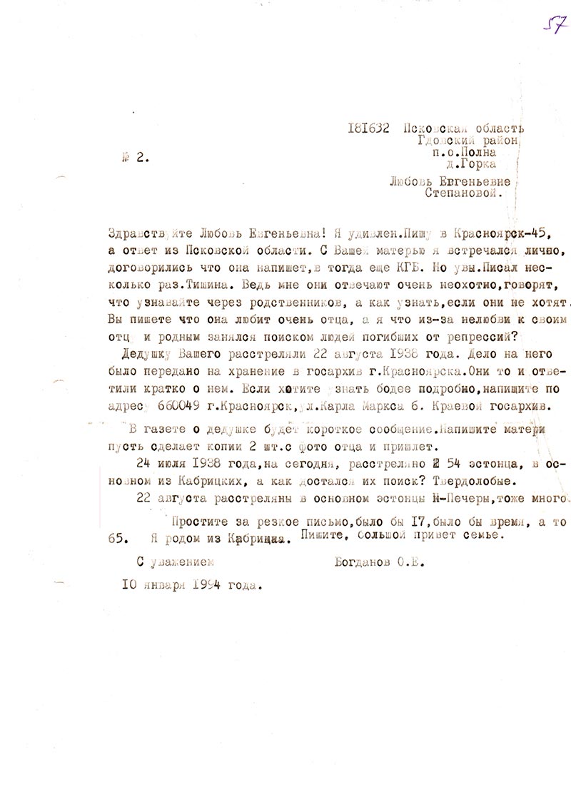 Здравствуйте Любовь Евгеньевна! Я удивлен. Пишу в Красноярск-45, а ответ из Псковской области. С Ваше матерью я встречался лично, договорились что она напишет, в тогда еще КГБ. Но увы. Писал несколько раз. Тишина. Ведь мне они отвечают очень неохотно, говорят, что узнавайте через родственников, а как узнать, если они не хотят. Вы пишете что она любит очень отца, а я что из-за нелюбви к своим отцу и родным занялся поиском людей погибших от репрессий?