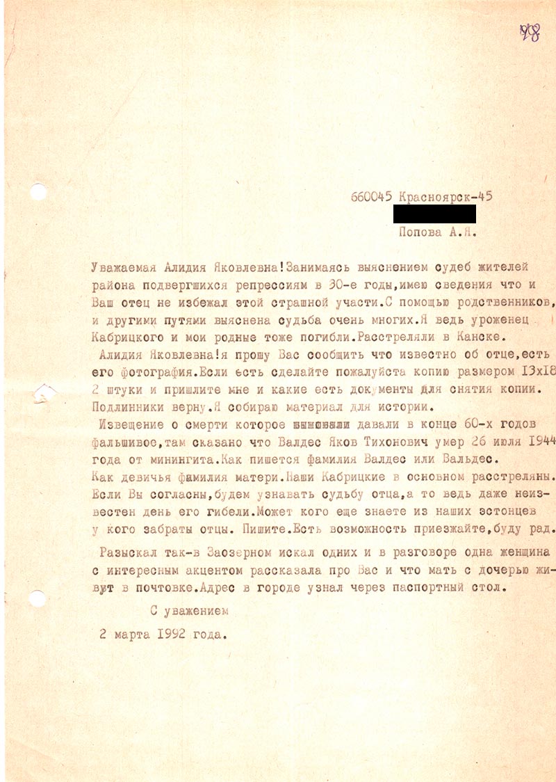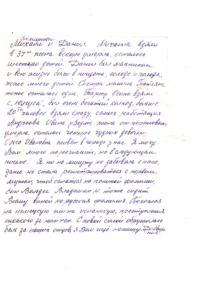 Ольга Ивановна живет в городе у нас. Я могу Вам много перечислить, но в следующем письме. Я ни на минуту не забыла о папе, даже не стала регистрироваться с первым мужем, чтоб остаться на папиной фамилии. Сын Вальдес Владимир Н. тоже сидит. Всему виной не русская фамилия. Похожая на немецкую или на испанскую, преступления никакого за ними нет. С новой силой обрушилась боль за наших отцов, я Вам еще напишу. До свидания.