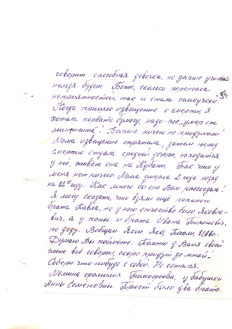Когда пришло извещение о смерти, я хотела порвать бумагу, надо же “умер от менингита”! Больше ничего не придумали! Мама извещение спрятала, затем перед смертью отдала средней дочери, находится у нее, живет она на Кубани. Так что у меня нет ничего. Мама умерла 2 года назад на 82-м году. Как много бы она Вам рассказала! Я могу сказать, что взяли еще папиного брата Павла, но у него отчество было Яковлевич, а у папы и брата Ивана — Тихонович, по деду. Вобщем Ясси, Яко, Паали, Ивво. Думаю Вы поймете. Помню д. Ваня своей жене говорил, скоро придут за мной. Собери что-нибудь с собой. Но остался. Мамина фамилия Тимофеева. У бабушки Анны Семеновны Прост было два брата. Тимофеевы Михаил и Данил. Михаила взяли в 37м, жена вскоре умерла, осталось шестеро детей. Данил был мельником и всю жизнь были в нищете, голоде и холоде, тоже много детей. Сестра мамина Татьяна тоже осталась одна, Тарту Осипа взяли с “Юлгуса”, был очень богатый колхоз, больше 20-ти человек взяли сразу, самых работящих. Андреева Ивана увезли, жена от переживаний умерла, остались четыре чудных девочки.