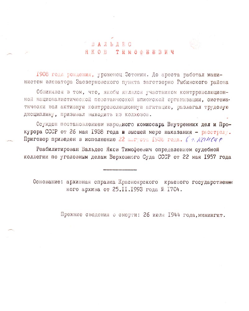 Реабилитирован Вальдес Яков Тимофеевич определением судебной коллегии по уголовным делам Верховного Суда СССР от 22 мая 1957 года.