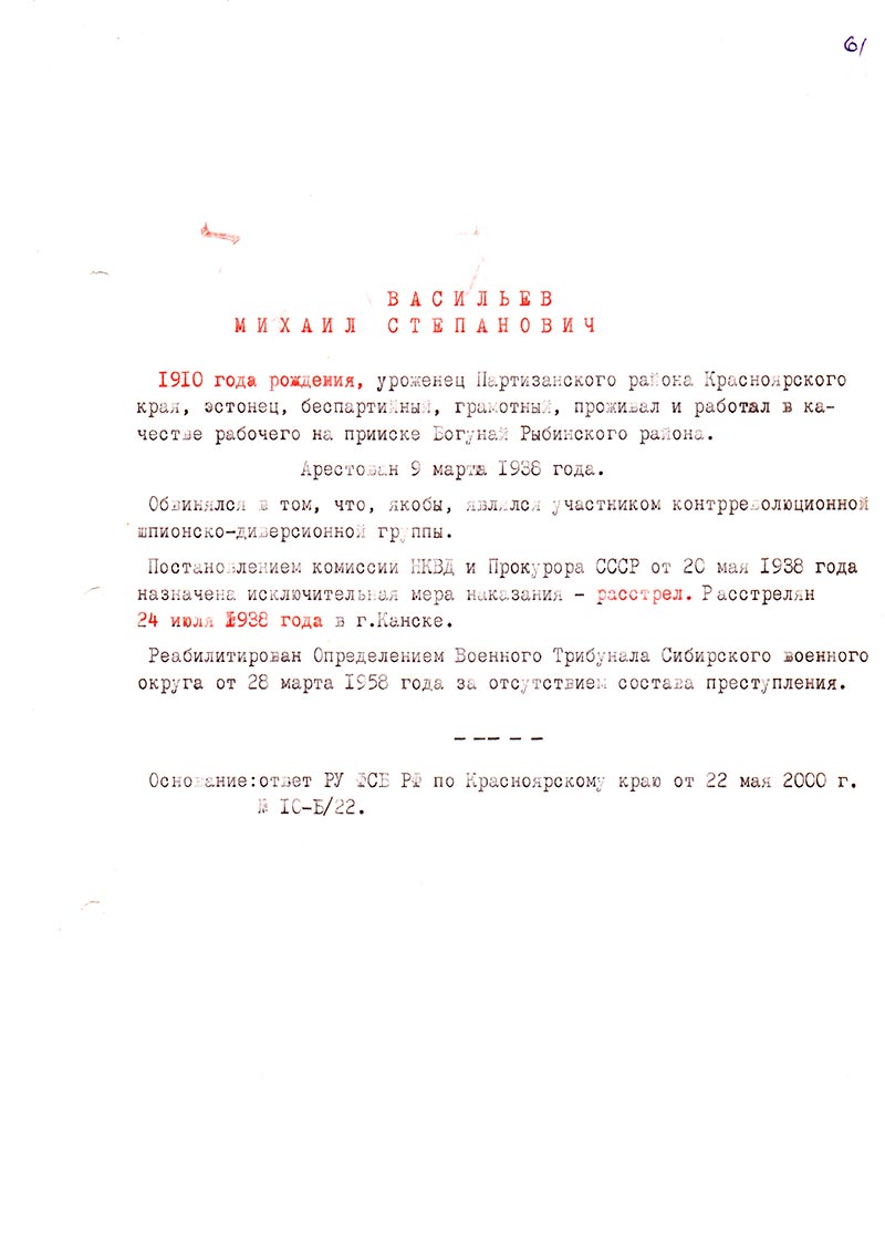 Основание: ответ РУ ФСБ РФ по Красноярскому краю от 22 мая 2000 г. № 10-Б/22.