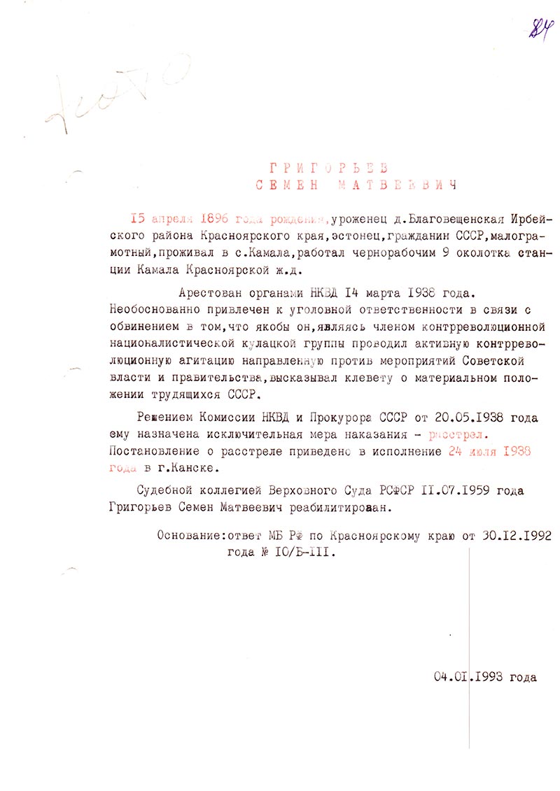 Судебной коллегией Верховного Суда РСФСР 11.07.1959 года Григорьев Семен Матвеевич реабилитирован.