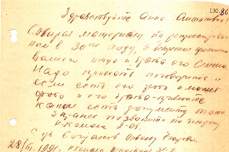 Собирая материалы по репрессированным в 30-е годы, я встретил фамилию Вашего отца и брата его Семена. Надо приехать поговорить и если есть его фото и может фото и его брата — привезите. Какие есть документы тоже. Заранее позвоните по телефону Н-Камала 2-05.