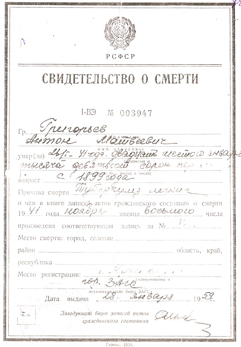 умер 26/I-41 года двадцать шестого января тысяча девятьсот сорок первого года