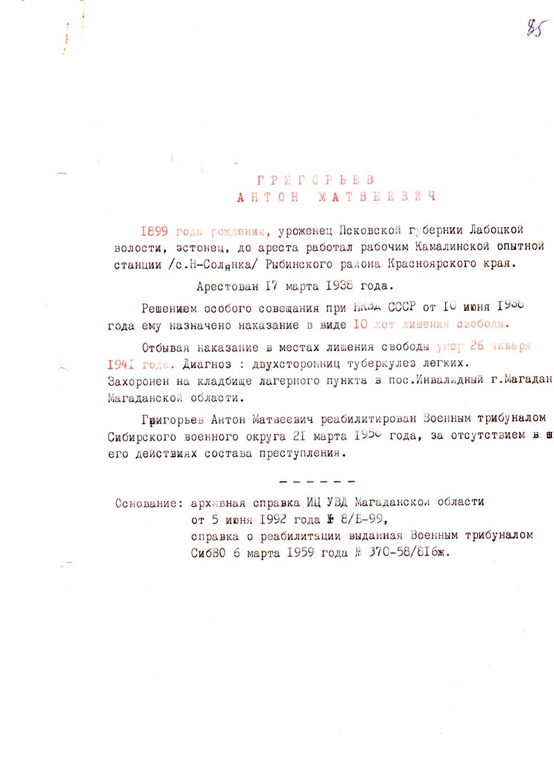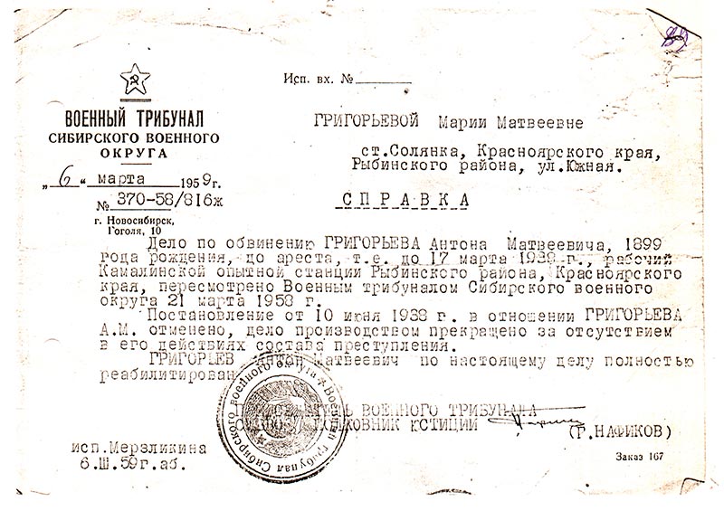 Григорьев Антон Матвеевич реабилитирован Военным трибуналом Сибирского военного округа 21 марта 1958 года, за отсутствием в его действиях состава преступления.