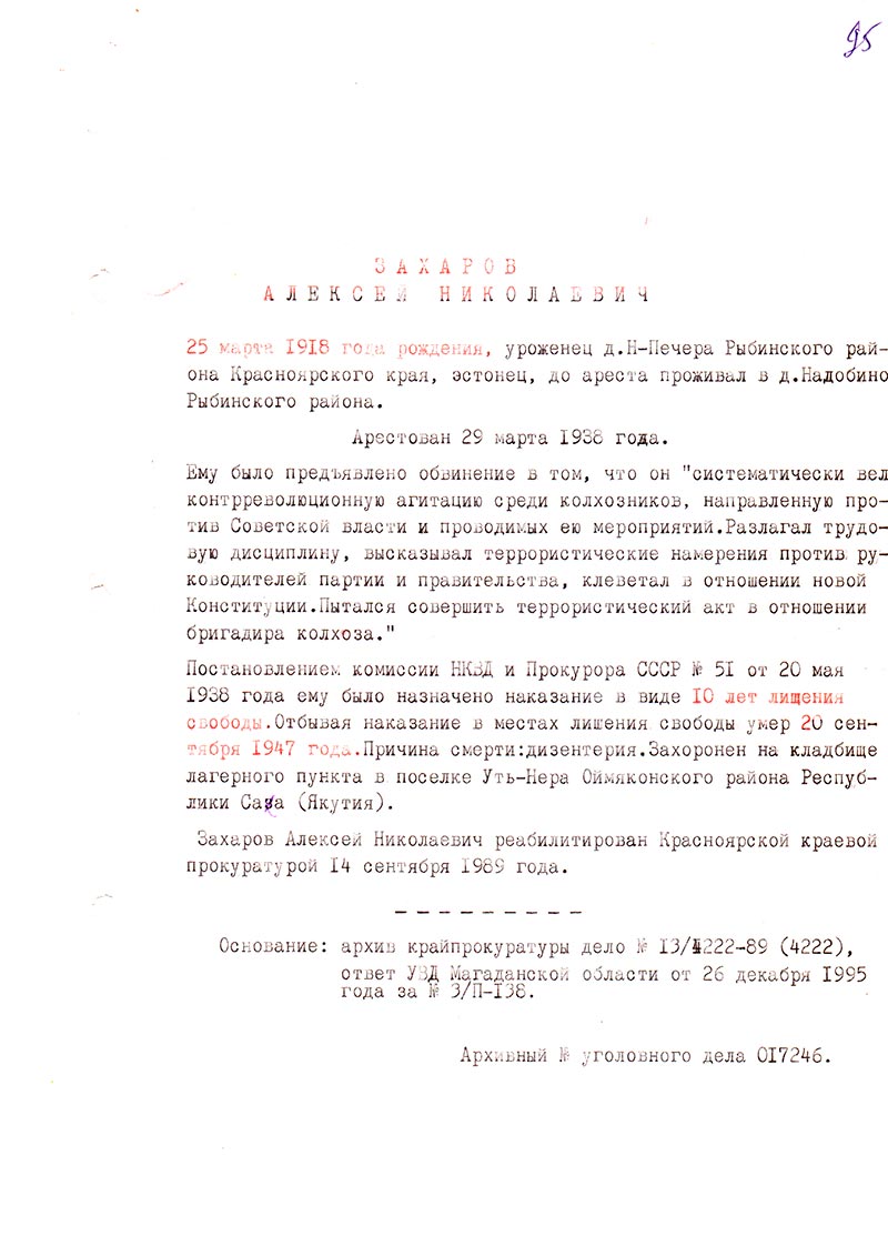 Захаров Алексей Николаевич реабилитирован Красноярской краевой прокуратурой 14 сентября 1989 года.