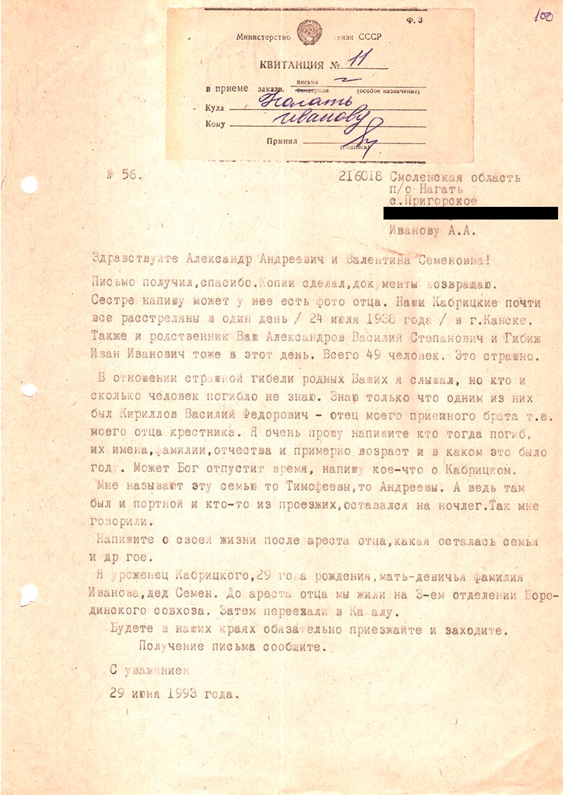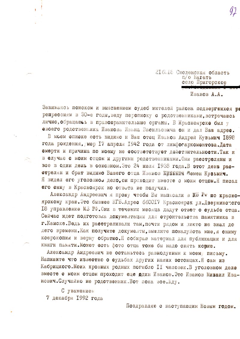 Александр Андреевич не останьтесь равнодушным к моем письму. Напишите что известно о судьбах других наших эстонцах. Я сам из Кабрицкого. Моих кровных родных погибло 11 человек. В уголовном деле вместе с моим отцом проходит еще один Иванов. Это Иванов Михаил Иванович. Случайно не родственник. Вот пока все. Жду.