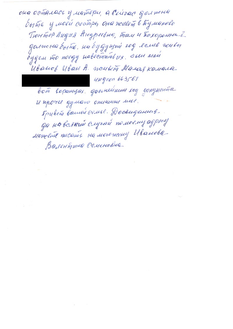 А на счет Иванова Михаила Ивановича, у меня в голове крутится этот человек, но не могу припомнить если вспомню я тебе напишу. Вас я некоторых помню еще по Шалагино. Ивана конечно я знаю. Если ты житель Кабрицкий, то наверное знаешь о гибели всей семьи материного брата Андрея, бабушку, родную мою сестру и ее мать, и портного. Один шофер мне проболтался, когда он участвовал при разбое. На счет фотографии, у меня ее нет, она осталась у матери, а сейчас должна быть у моей сестры, она живет в Тумаково. Гюнтер Лидия Андреевна, там и похоронная должна быть. На будущий год если живы будем, то поеду навестить их. Сын мой Иванов Иван А. живет Малая Камала, индекс 663561.