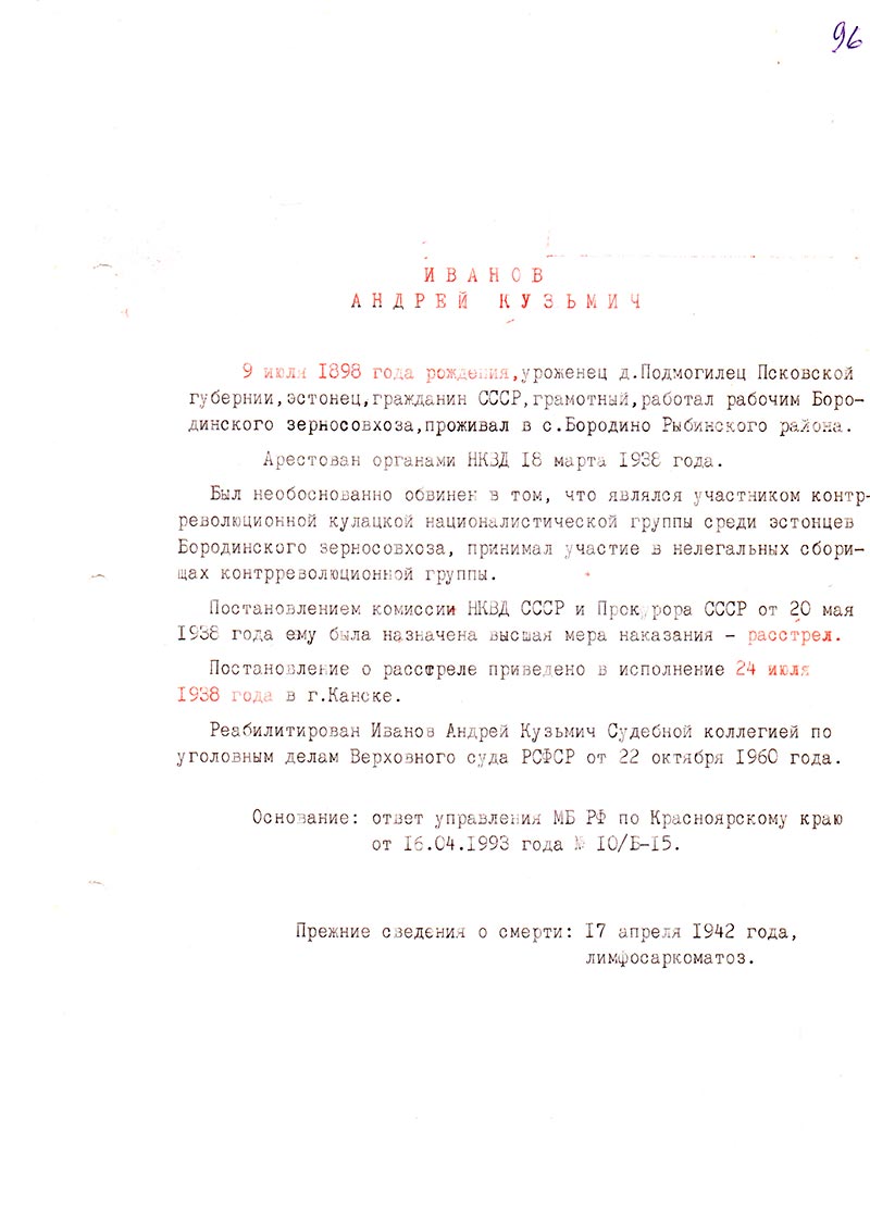 В моем описке есть видимо и Ваш отец Иванов Андрей Кузьмич 1898 года рождения, умер 17 апреля 1942 года от лимфосаркоментоза. Дата смерти и причина по моему не соответствуют действительности. Так и в случае с моим отцом и другими родственниками. Они расстреляны и все в один день в основном. Это 24 июля 1938 года. В этот день расстрелян и брат видимо Вашего отца Иванов Семен Кузьмич. Я видел его уголовное дело, он проходит вместе с моим отцом. Я писал его сыну в Красноярск но ответа не получил.