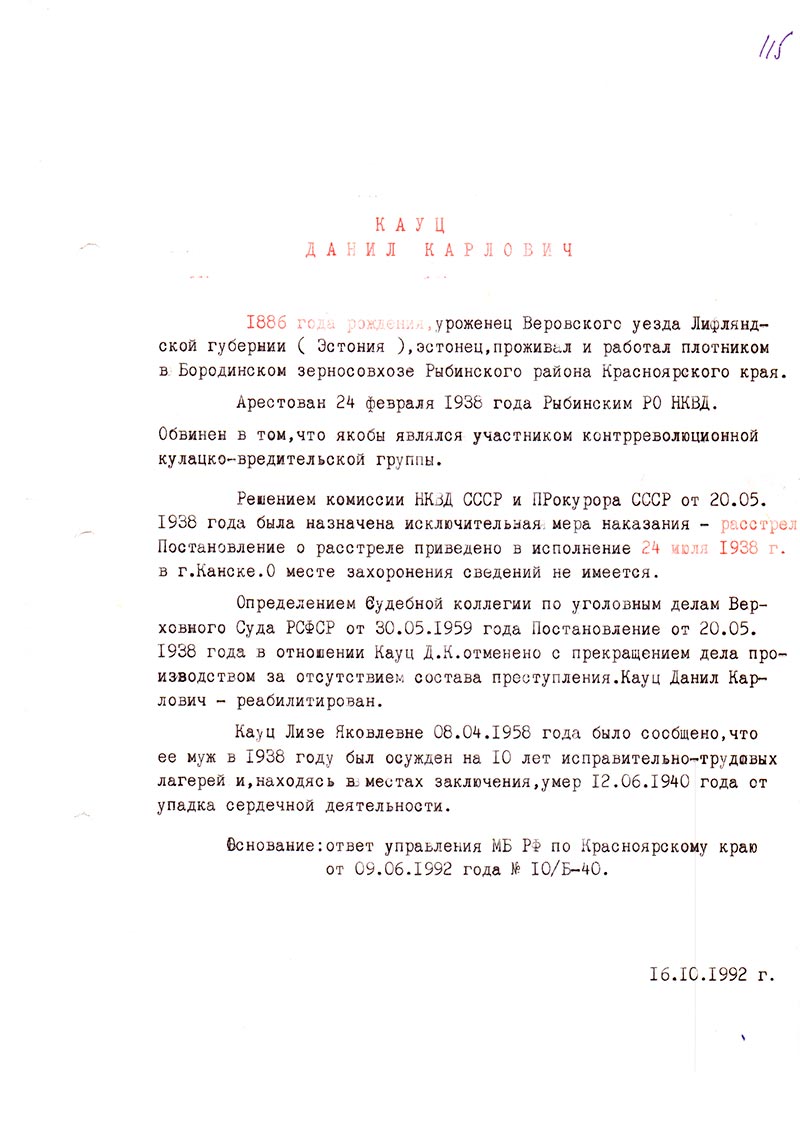 Определением Судебной коллегии по уголовным делам Верховного Суда РСФCP от 30.05.1959 года постановление от 20.05.1938 года в отношении Кауц Д.К. отменено с прекращением дела производством за отсутствием состава преступления. Кауц Данил Карлович — реабилитирован.