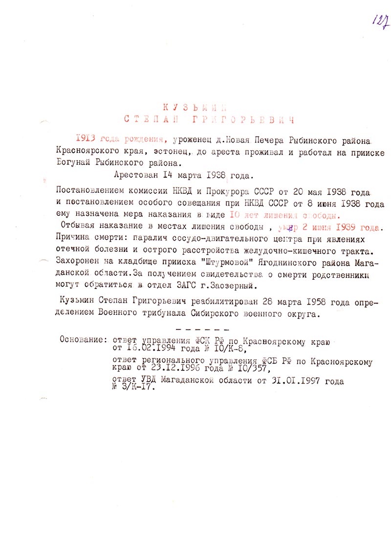 1913 года рождения, уроженец д. Новая Печера Рыбинского района Красноярского края, эстонец, до ареста проживал и работал на прииске Богунай Рыбинского района.