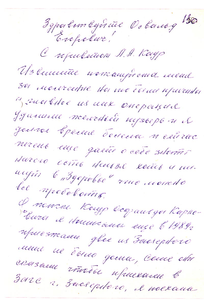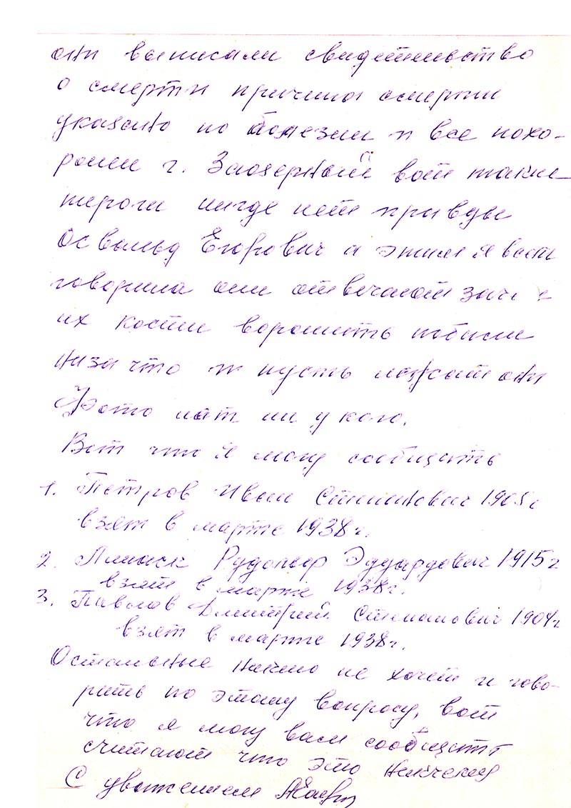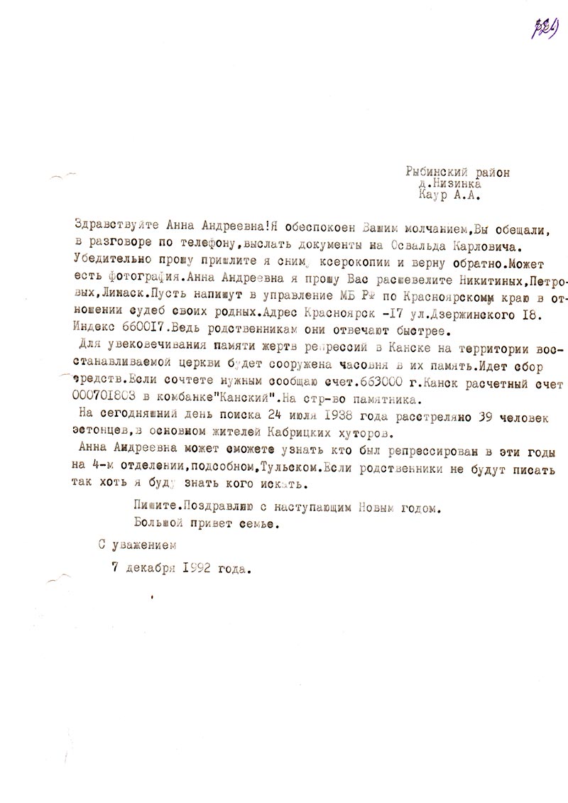 Здравствуйте Анна Андреевна! Я обеспокоен Вашим молчанием, Вы обещали, в разговоре по телефону, выслать документы на Освальда Карловича. Убедительно прошу пришлите я сниму ксерокопии и верну обратно. Может есть фотография. Анна Андреевна я прошу Вас расшевелите Никитиных, Петровых, Линаск. Пусть напишут в управление МБ РФ по Красноярскому краю в отношении судеб своих родных. Адрес Красноярск-17 ул. Дзержинского 18. Индекс 660017. Ведь родственникам они отвечают быстрее.