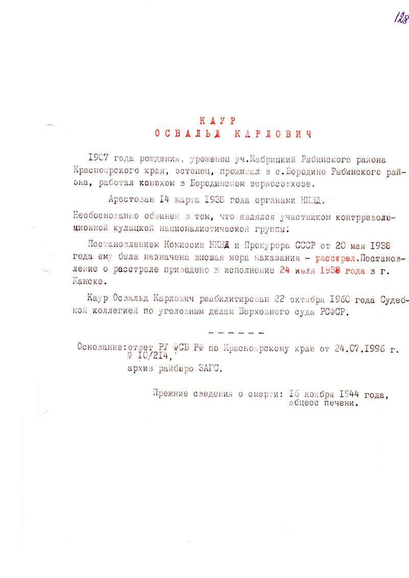 Каур Освальд Карлович реабилитирован 22 октября 1960 года Судебной коллегией по уголовным делам Верховного суда РСФСР.