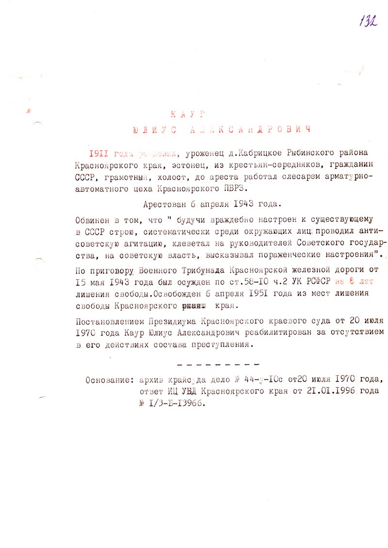 Постановлением Президиума Красноярского краевого суда от 20 июля 1970 года Каур Юлиус Александрович реабилитирован за отсутствием в его действиях состава преступления.