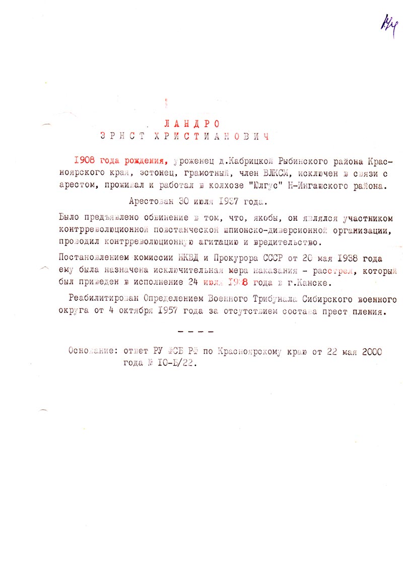 1908 года рождения, уроженец д. Кабрицкой Рыбинского района Красноярского края, эстонец, грамотный, член ВЛКСМ, исключен в связи с арестом, проживал и работал в колхозе “Юлгус” Н-Ингашского района.
