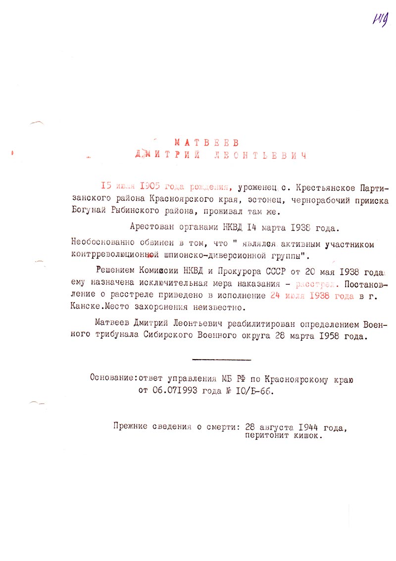 Матвеев Дмитрий Леонтьевич реабилитирован определением Военного трибунала Сибирского Военного округа 28 марта 1958 года.