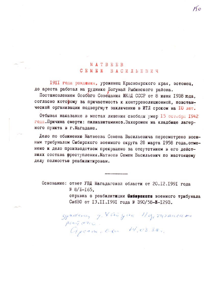 Дело по обвинению Матвеева Семена Васильевича пересмотрено военным трибуналом Сибирского военного округа 28 марта 1958 года, отменено и дело производством прекращено за отсутствием в его действиях состава преступления. Матвеев Семен Васильевич по настоящему делу полностью реабилитирован.