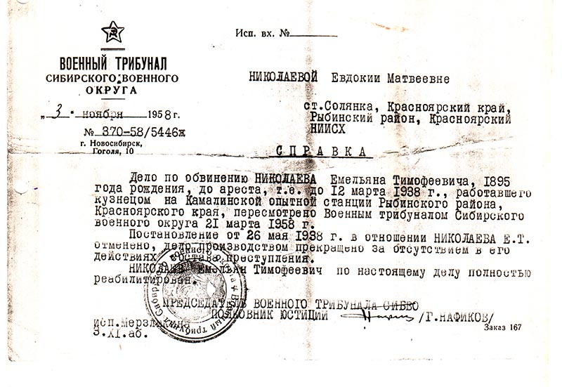Николаев Емельян Тимофеевич по настоящему делу полностью реабилитирован.