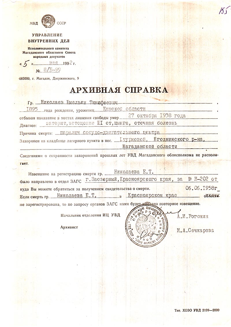 архивная справка Магаданского УВД от 05 мая 1992 года № 8/Б-99.