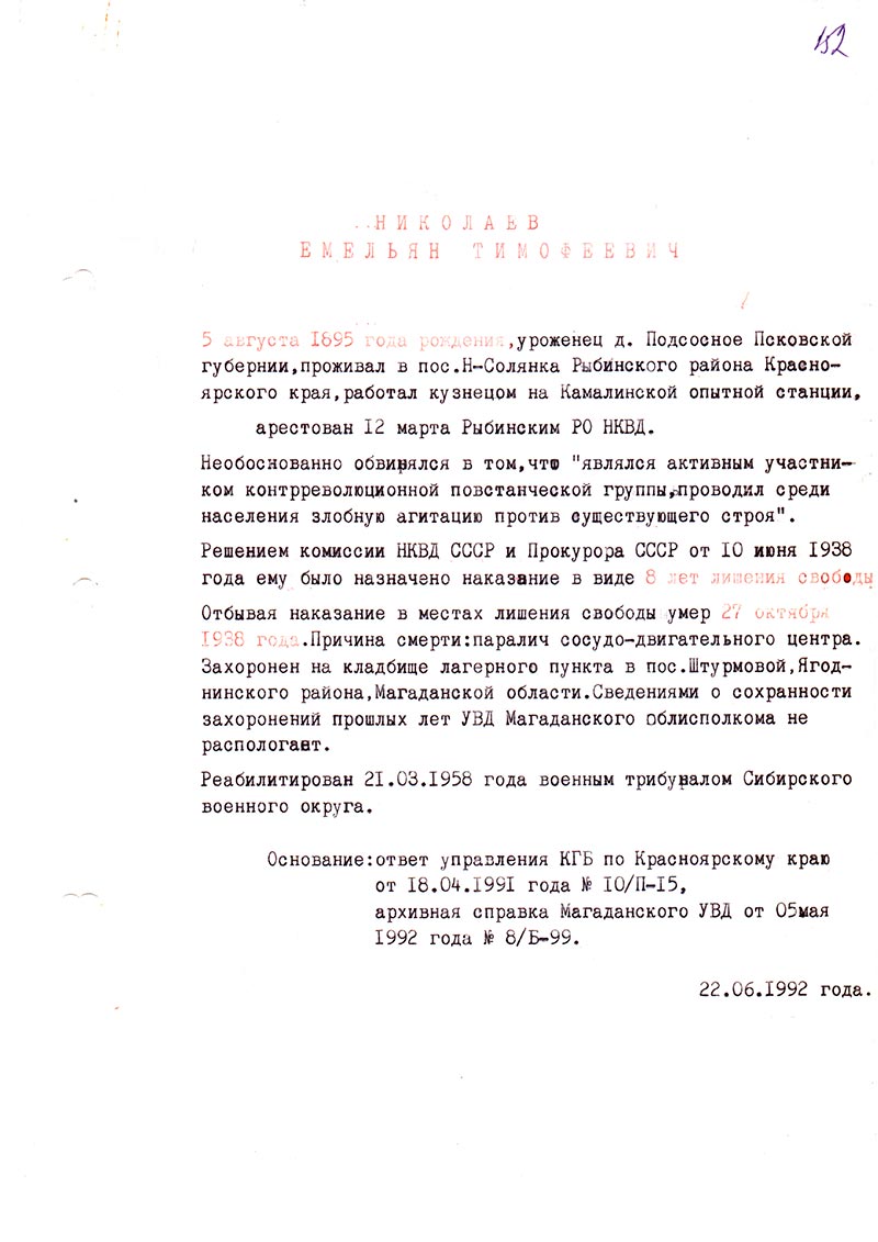 Основание: ответ управления КГБ по Красноярскому краю от 18.04.1991 года №