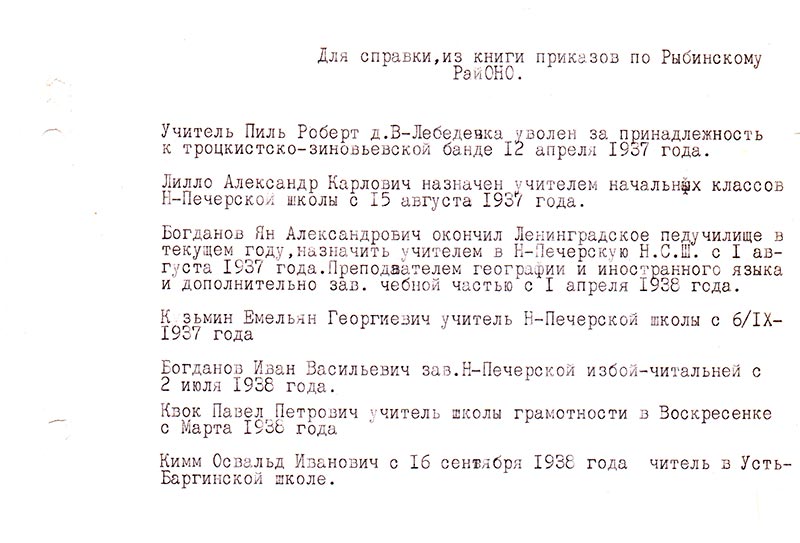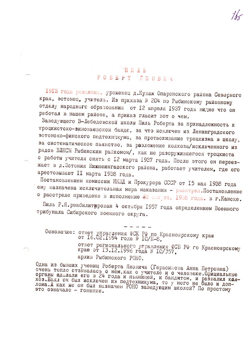 Заведующего В-Лебедевской школы Пиль Роберта за принадлежность к троцкистско-зиновьевской банде, за что исключен из Ленинградского эстонско-финского педтехникума, за протаскивание троцкизма в школу, за систематическое пьянство, за разложение колхоза (исключенного из рядов ВЛКСМ Рыбинским райкомом), как не разоружившегося троцкиста с работы учителя снять с 12 марта 1937 года. После этого он переезжает в д. Эстония Нижнеингашского района, работает учителем, где его арестовывают 11 марта 1938 года.