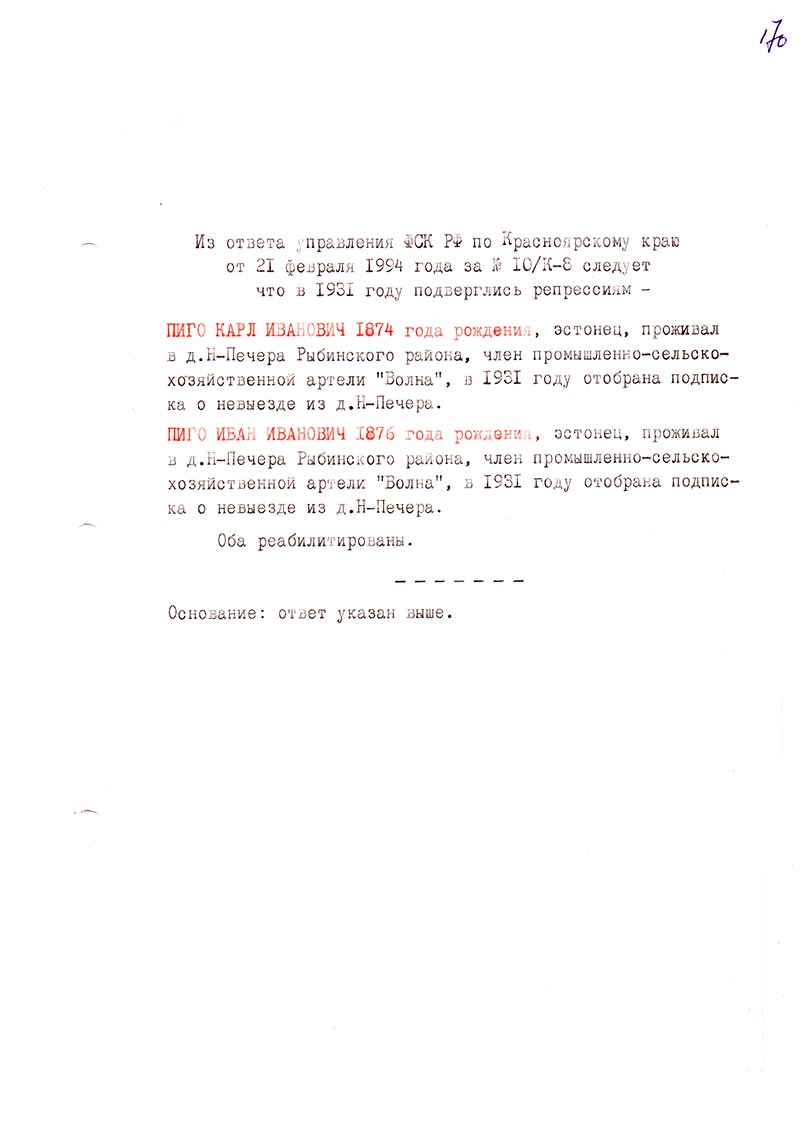 Из ответа управления ФСК РФ по Красноярскому краю от 21 февраля 1994 года за № 10/К-8 следует что в 1931 году подверглись репрессиям —
