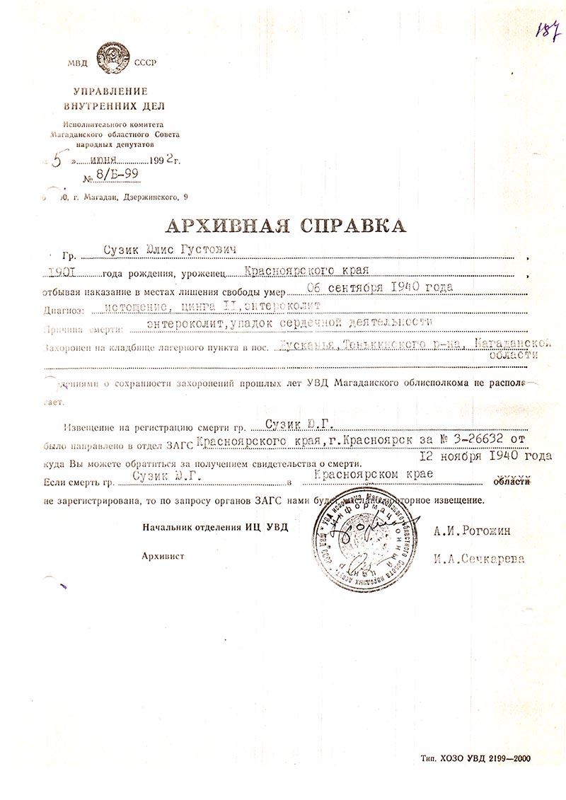 Гр. Сузик Юлиус Густавович 1901 года рождения, уроженец Красноярского края, отбывая наказание в местах лишения свободы умер 06 сентября 1940 года.