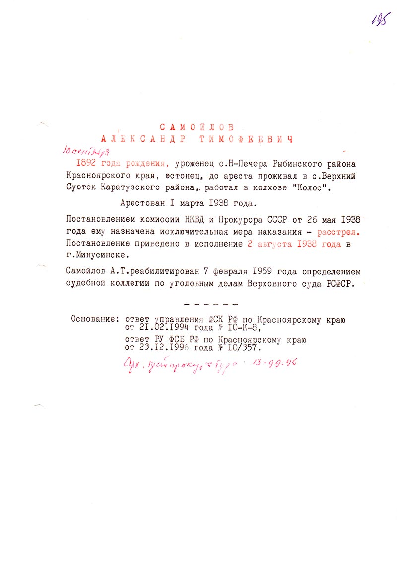 Самойлов А.Т. реабилитирован 7 февраля 1959 года определением судебной коллегии по уголовным делам Верховного суда РСФСР.