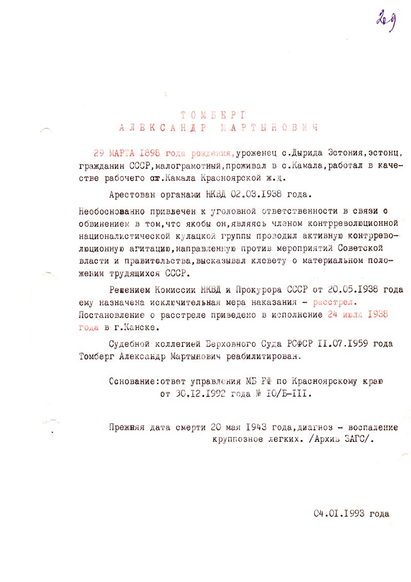 Судебной коллегией Верховного Суда РСФСР 11.07.1959 года Томберг Александр Мартынович реабилитирован.
