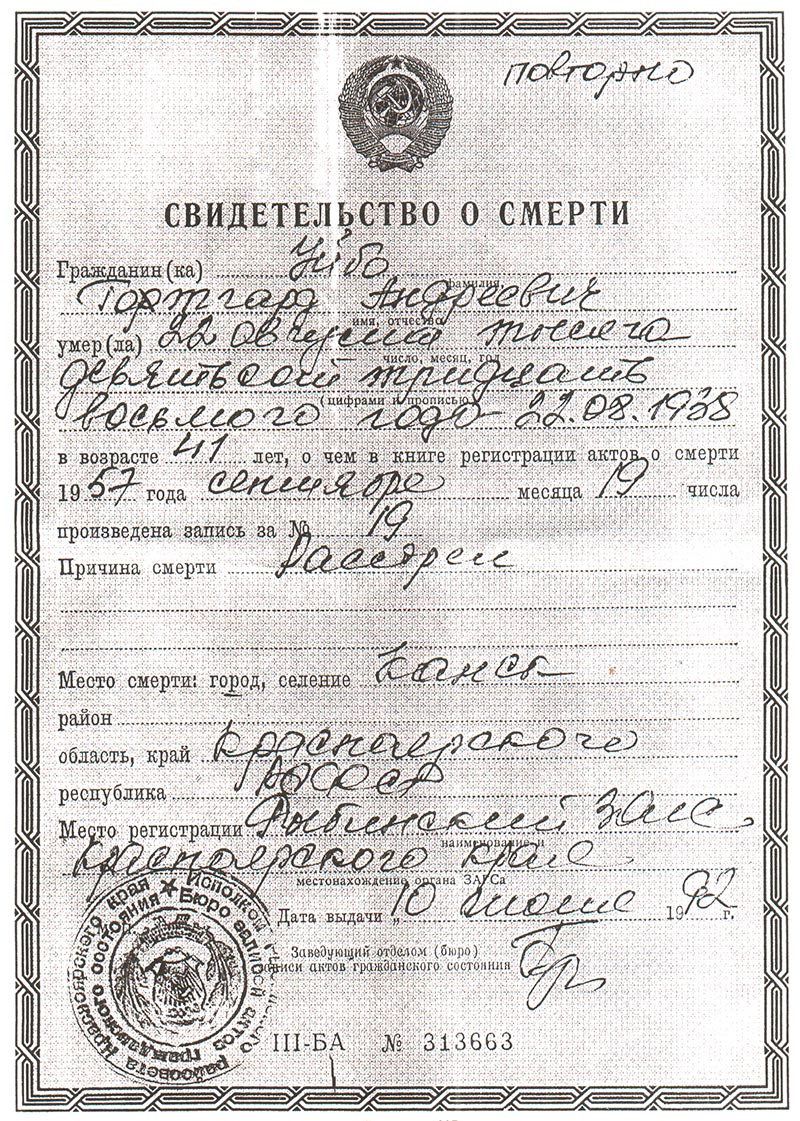 Смерть Умбо Г.А. ранее была зарегистрирована в Рыбинском отделе ЗАГС как наступившая, якобы, 07.10. 1943 года в местах лишения свободы от абсцесса печени.