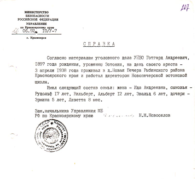 4 июля 1897 года рождения, уроженец Эстонии, проживал в д. Н-Печера Рыбинского района Красноярского края, работал директором Новопечерской эстонской школы. Имел состав семьи: жена — Ида Андреевна, сыновья — Рудольф 17 лет, Вильберт, Альберт 12 лет, Эвальд 6 лет, дочери — Эрмина 5 лет, Лизетта 8 месяцев.