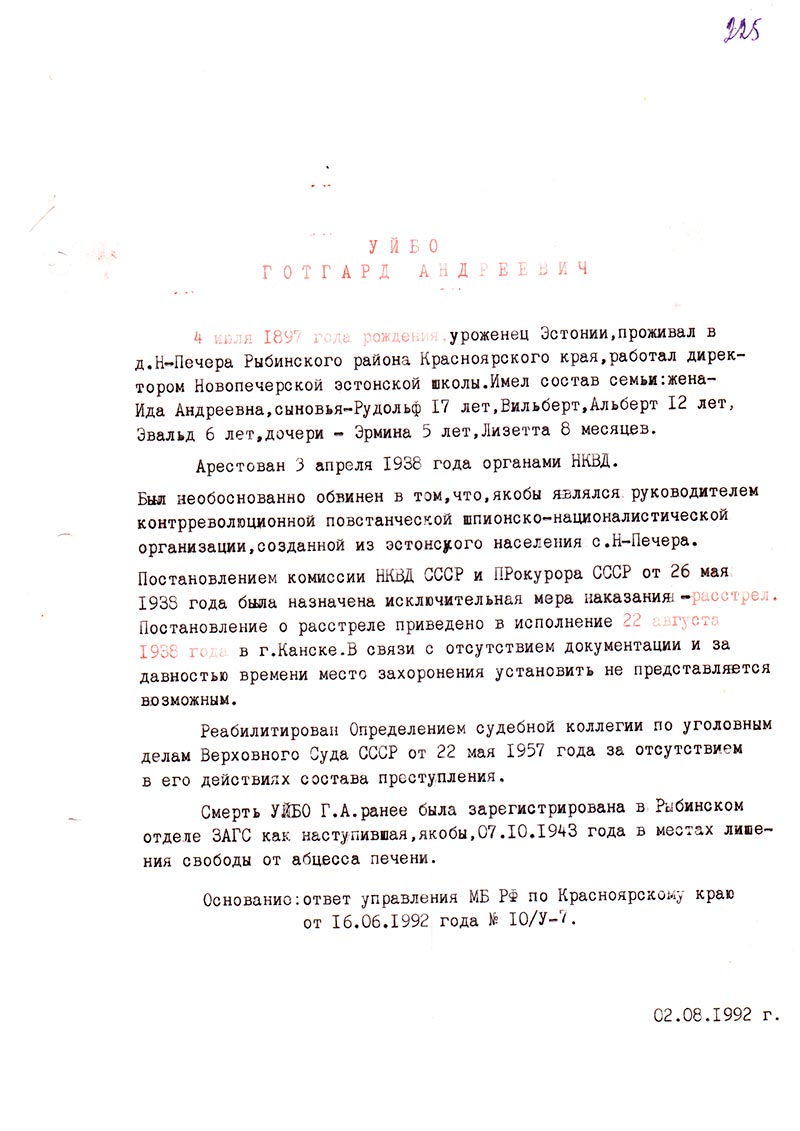 Согласно материалам уголовного дела Уйбо Готгард Андреевич, 1897 года