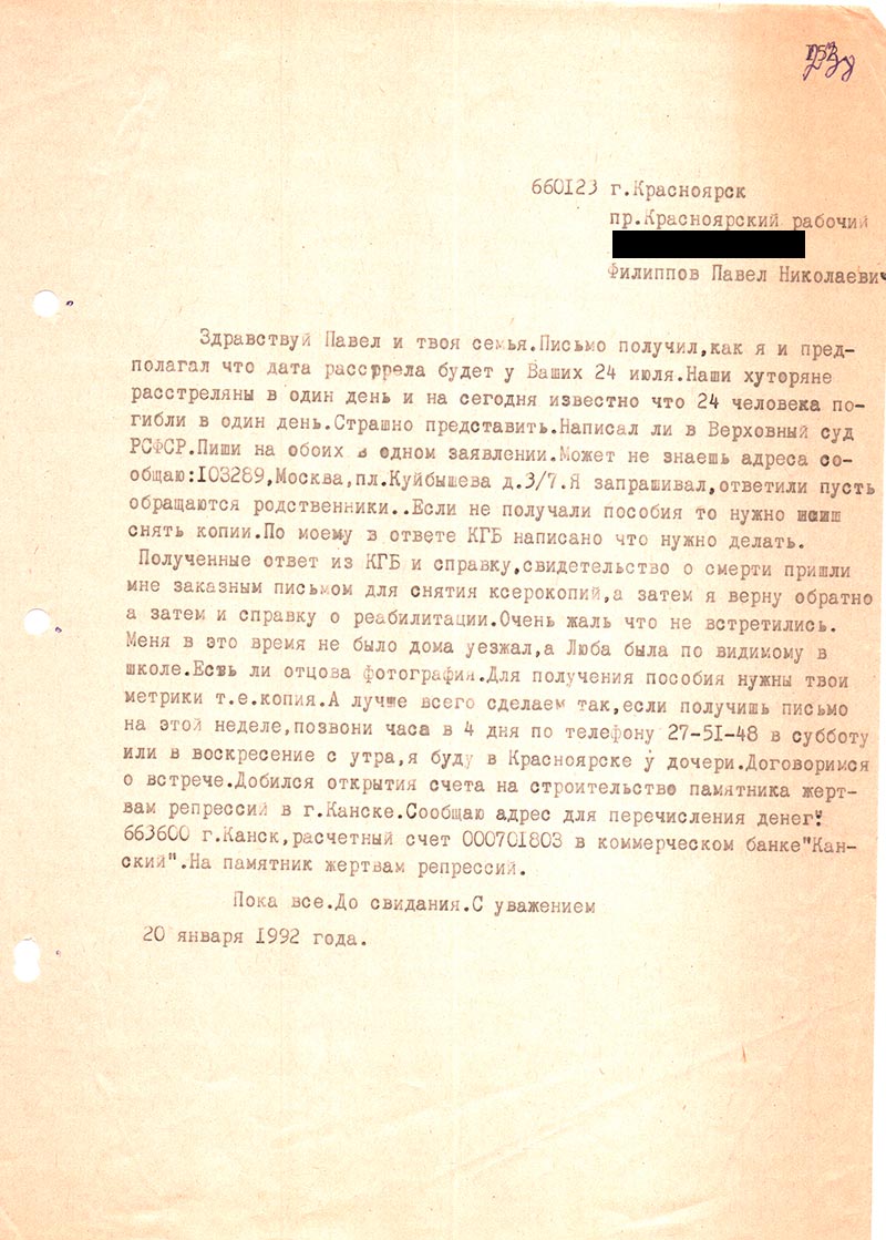 Полученные ответ из КГБ и справку, свидетельство о смерти пришли мне заказным письмом для снятия ксерокопий, а затем я верну обратно а затем и справку о реабилитации. Очень жаль что не встретились. Меня в это время не было дома уезжал, а Люба была по видимому в школе. Есть ли отцова фотография. Для получения пособия нужны твои метрики т.е. копия. А лучше всего сделаем так, если получишь письмо на этой неделе, позвони часа в 4 дня по телефону 27-51-48 в субботу или в воскресение с утра, я буду в Красноярске у дочери. Договоримся о встрече. Добился открытия счета на строительство памятника жертвам репрессий в г. Канске. Сообщаю адрес для перечисления денег: