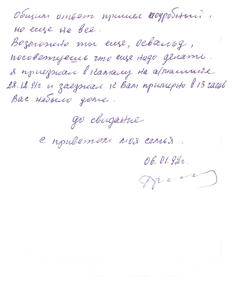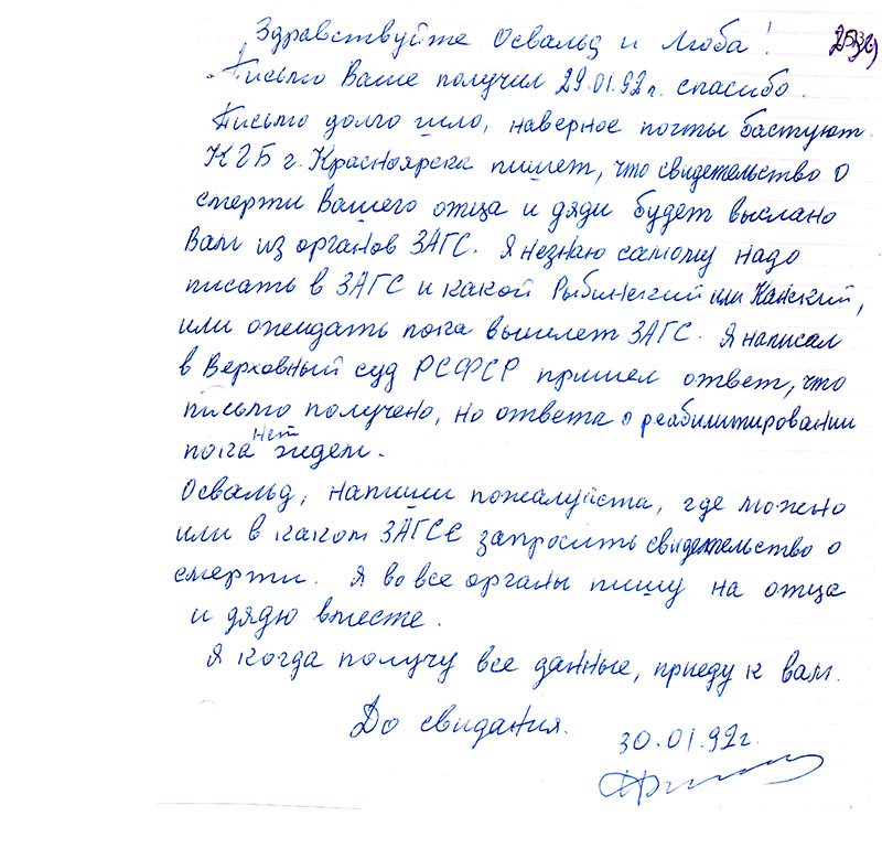 Письмо Ваше получил 29.01.92 г. спасибо. Письмо долго шло, наверное почты бастуют. КГБ г. Красноярска пишет, что свидетельство о смерти Вашего отца и дяди будет выслано Вам из органов ЗАГС. Я незнаю самому надо писать в ЗАГС и какой Рыбинский или Канский, или ожидать пока вышлет ЗАГС. Я написал в Верховный суд РСФСР пришел ответ, что письмо получено, но ответа о реабилитировании пока нет, ждем.