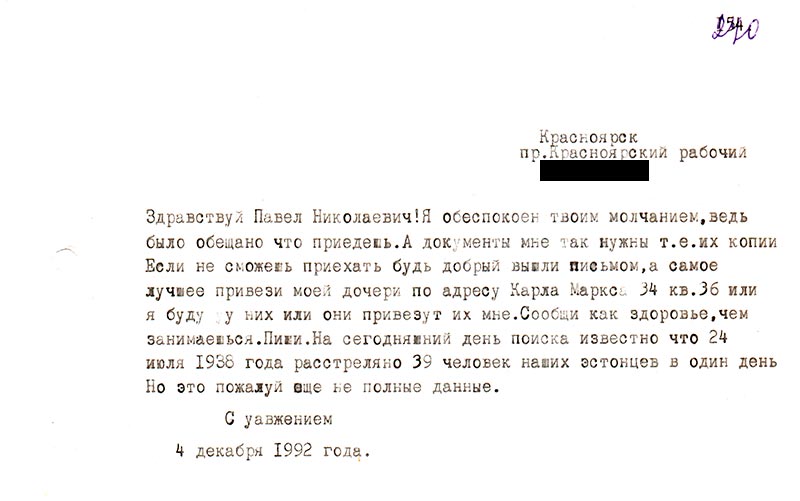 Я писал от имени Лидии Петровны Пусеп в КГБ г. Красноярска о судьбе ее мужа Пусеп Августа, Пусеп Освальда, твоего отца, Вильсон Павла Петровича (брат твоей матери), Сапп Эдуарда Кузьмича. Ответили только более подробно об Пусеп Августе. Расстрелян 24/VII-1938 г. в Канске. Пусеп Освальда судьбу не знают. А твой отец, Вильсон и Сапп расстреляны в июле 1938 года и больше ничего. Ни числа ни где.