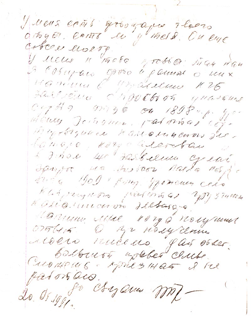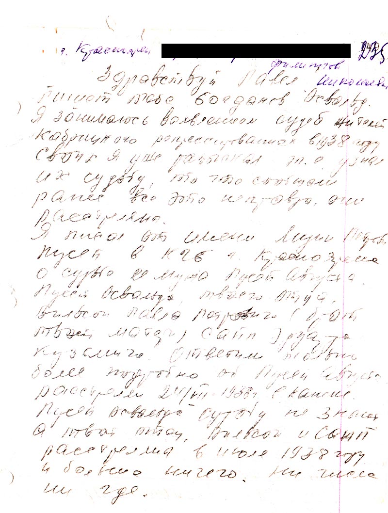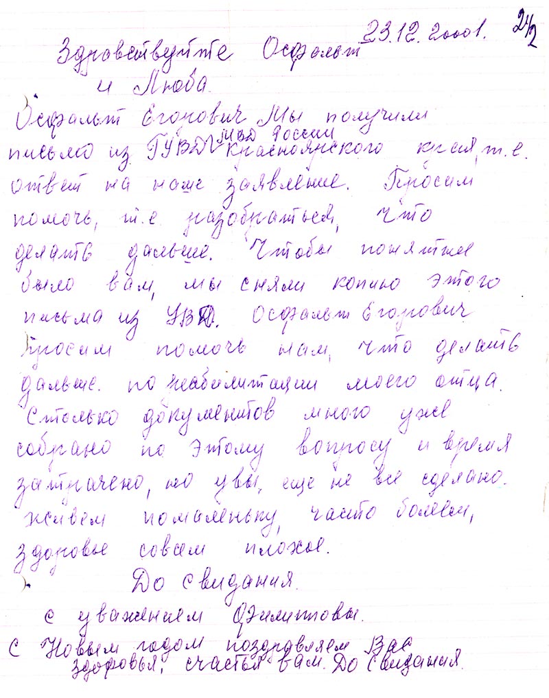 Здравствуй Павел и твоя семья. Письмо получил, как я и предполагал что дата расстрела будет у Ваших 24 июля. Наши хуторяне расстреляны в один день и на сегодня известно что 24 человека погибли в один день. Страшно представить. Написал ли в Верховный суд РСФСР. Пиши на обоих в одном заявлении. Может не знаешь адреса сообщаю :103289, Москва, пл. Куйбышева д. 3/7. Я запрашивал, ответили пусть обращаются родственники. Если не получали пособия то нужно снять копии. По моему в ответе КГБ написано что нужно делать.