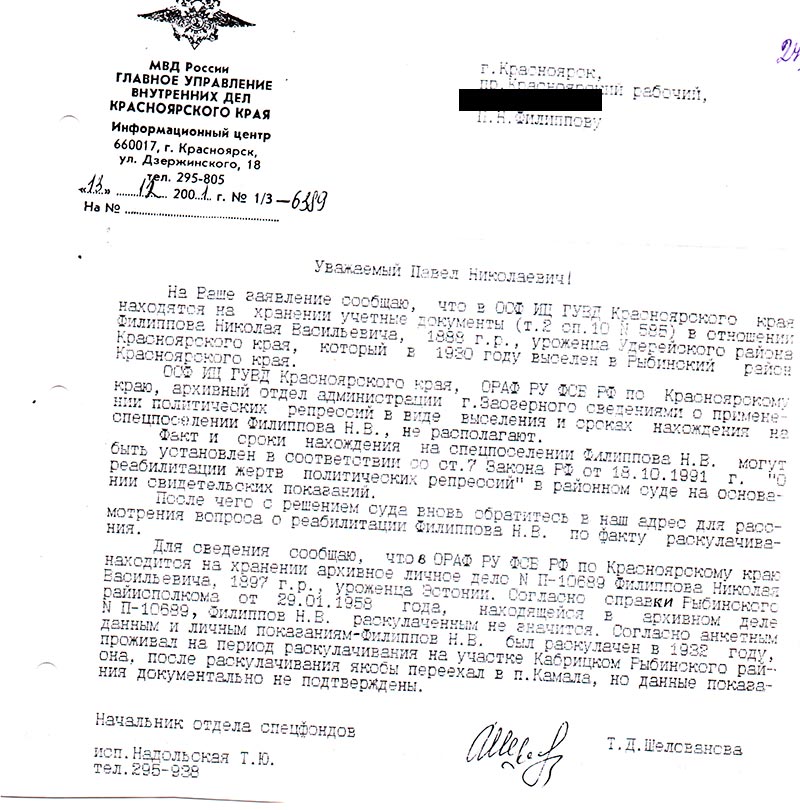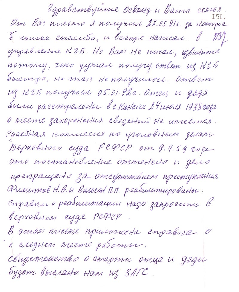 От Вас письмо я получил 27.05.91 г. за которое большое спасибо, и вскоре написал в уравнение КГБ. Но Вам не писал, извините потому что думал получу ответ из КГБ быстро, но так не получилось. Ответ из КГБ получил 05.01.92 г. Отец и дядя были расстреляны в г. Канске 24 июля 1938 года. О месте захоронения сведений не имеется. Судебная комиссия по уголовным делам Верховного суда РСФСР от 9.4.59 года это постановление отменено и дело прекращено за отсутствием преступления. Филиппов Н.В. И Вильсон П.П. реабилитированы. Справки о реабилитации надо запросить в верховном суде РСФСР.