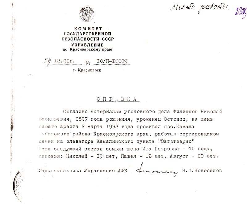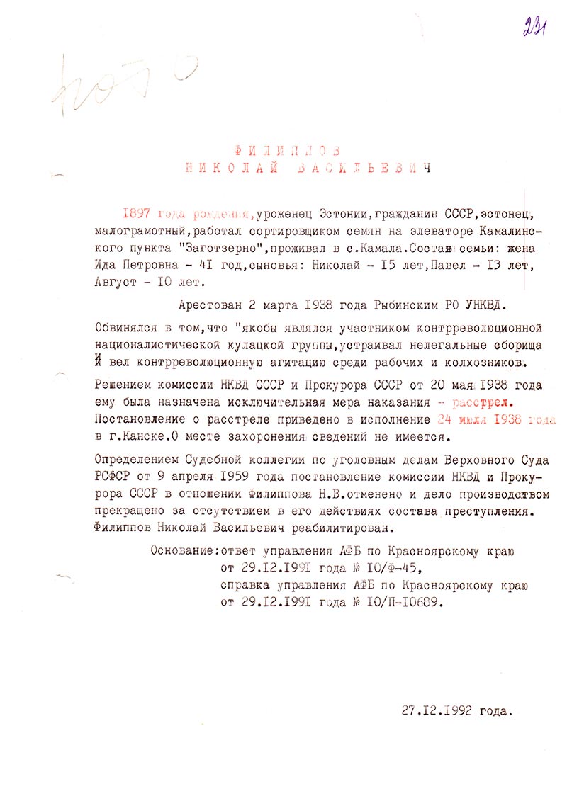 Согласно материалам уголовного дела Филиппов Николай Васильевич, 1897 года рождения, уроженец Эстонии, на день своего ареста 2 марта 1938 года проживал пос. Камала Рыбинского района Красноярского края, работал сортировщиком семян на элеваторе Камалинского пункта “Заготзерно”. Имел следующий состав семи: жена Ита Петровна — 41 года, сыновья: Николай — 15 лет, Павел — 13 лет, Август — 10 лет.