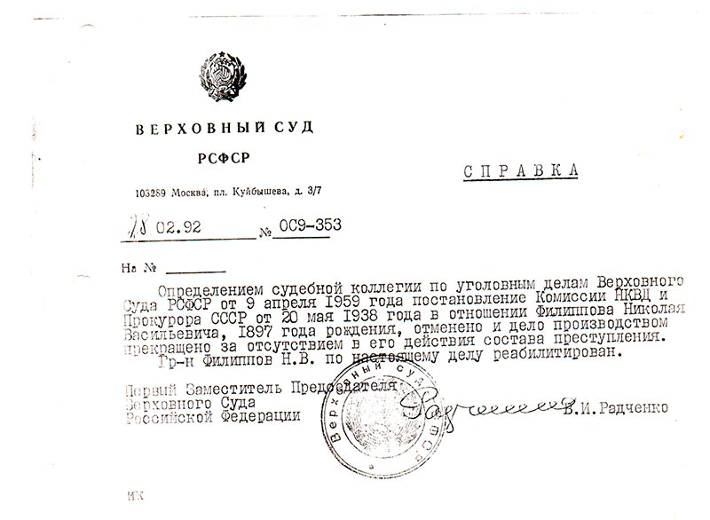 Определением Судебной коллегии по уголовным делам Верховного Суда PCФСР от 9 апреля 1959 года постановление комиссии НКВД и Прокурора СССР в отношении Филиппова Н.В. отменено и дело производством прекращено за отсутствием в его действиях состава преступления. Филиппов Николай Васильевич реабилитирован.