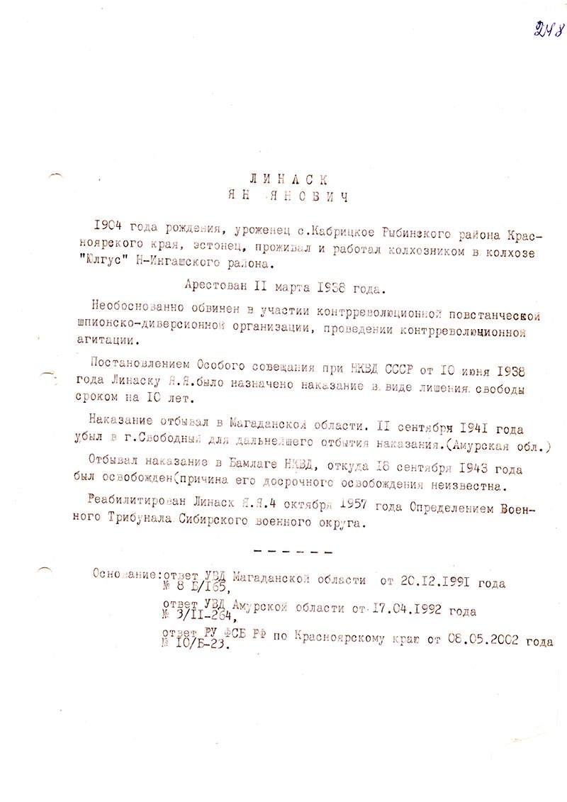Реабилитирован Линаск Я.Я. 4 октября 1957 года Определением Военного Трибунала Сибирского военного округа.