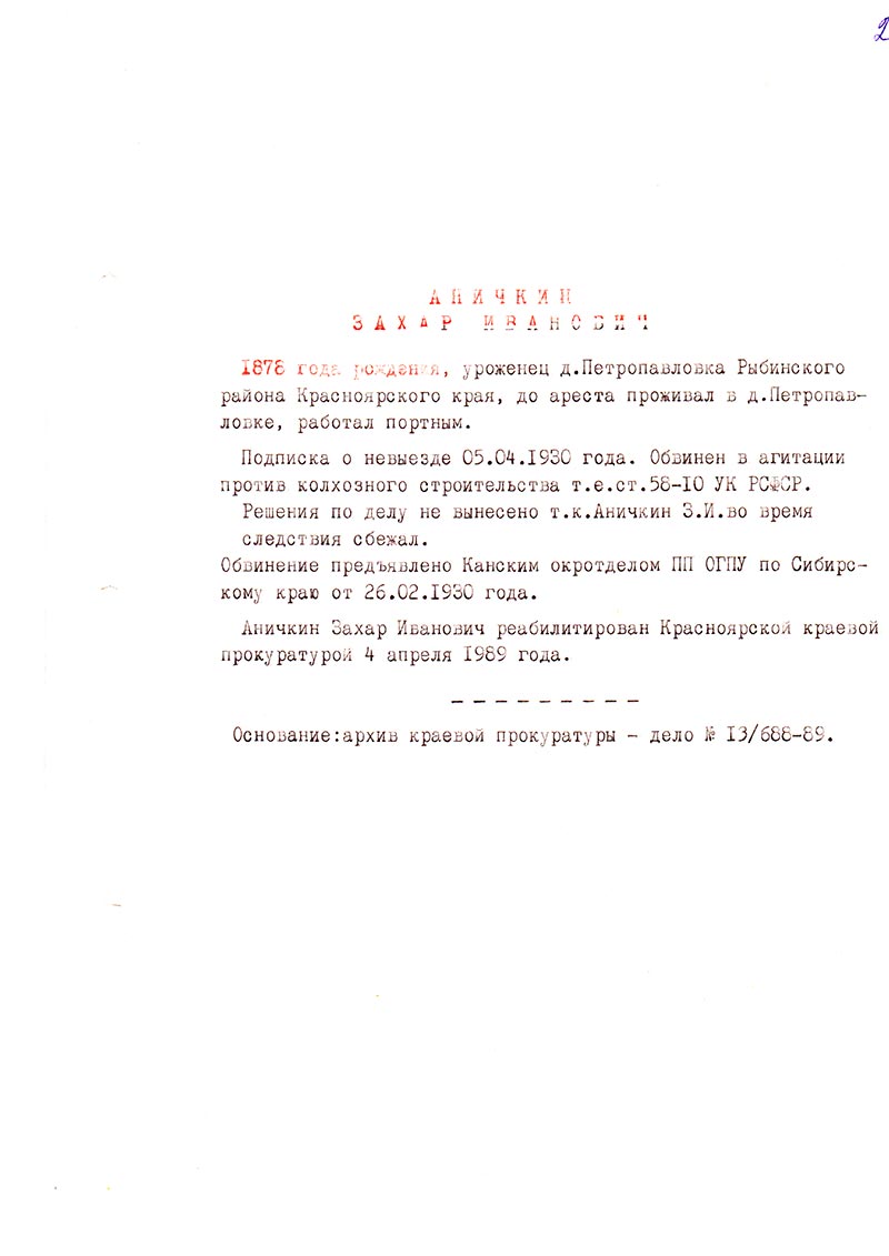 Аничкин Захар Иванович реабилитирован Красноярской краевой прокуратурой 4 апреля 1989 года.