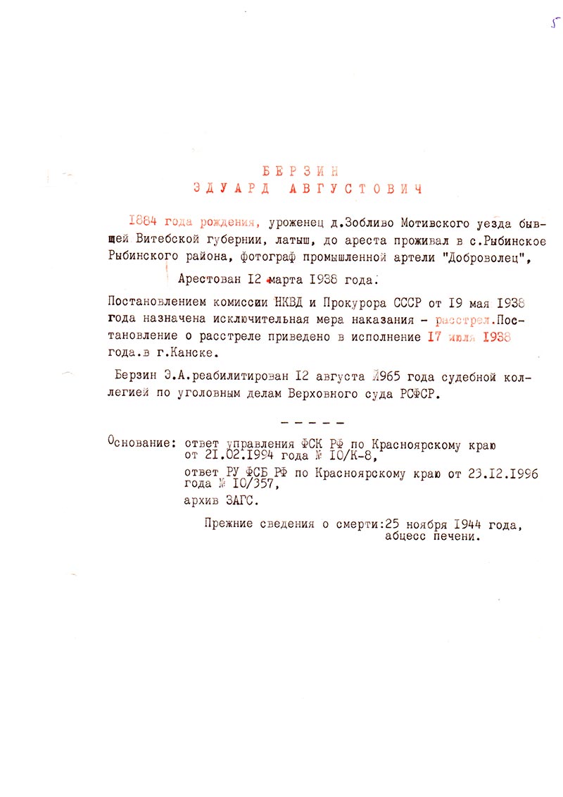 Берзин Э.А. реабилитирован 12 августа 1965 года судебной коллегией по уголовным делам Верховного суда РСФСР.