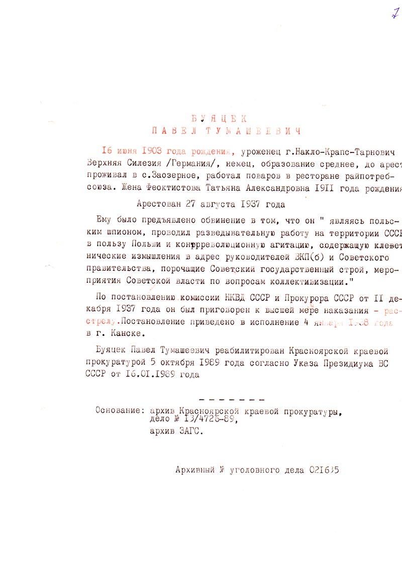 Буяцек Павел Тумашеевич реабилитирован Красноярской краевой прокуратурой 5 октября 1989 года согласно Указа Президиума ВС СССР от 16.01.1989 года.